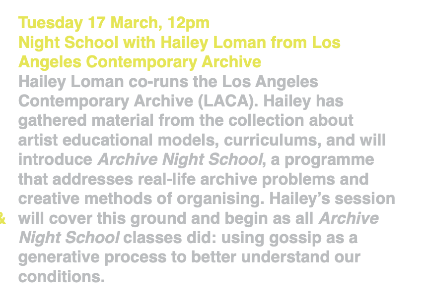 Hailey Loman co-runs the Los Angeles Contemporary Archive (LACA). Hailey has gathered material from the collection about alternative artist educational models, curriculums, and will introduce Archive Night School, a programme that addresses real-life archive problems and creative methods of organising. Hailey’s session will cover this ground and begin as all Archive Night School classes did: using gossip as a generative archiving process to better understand our conditions.